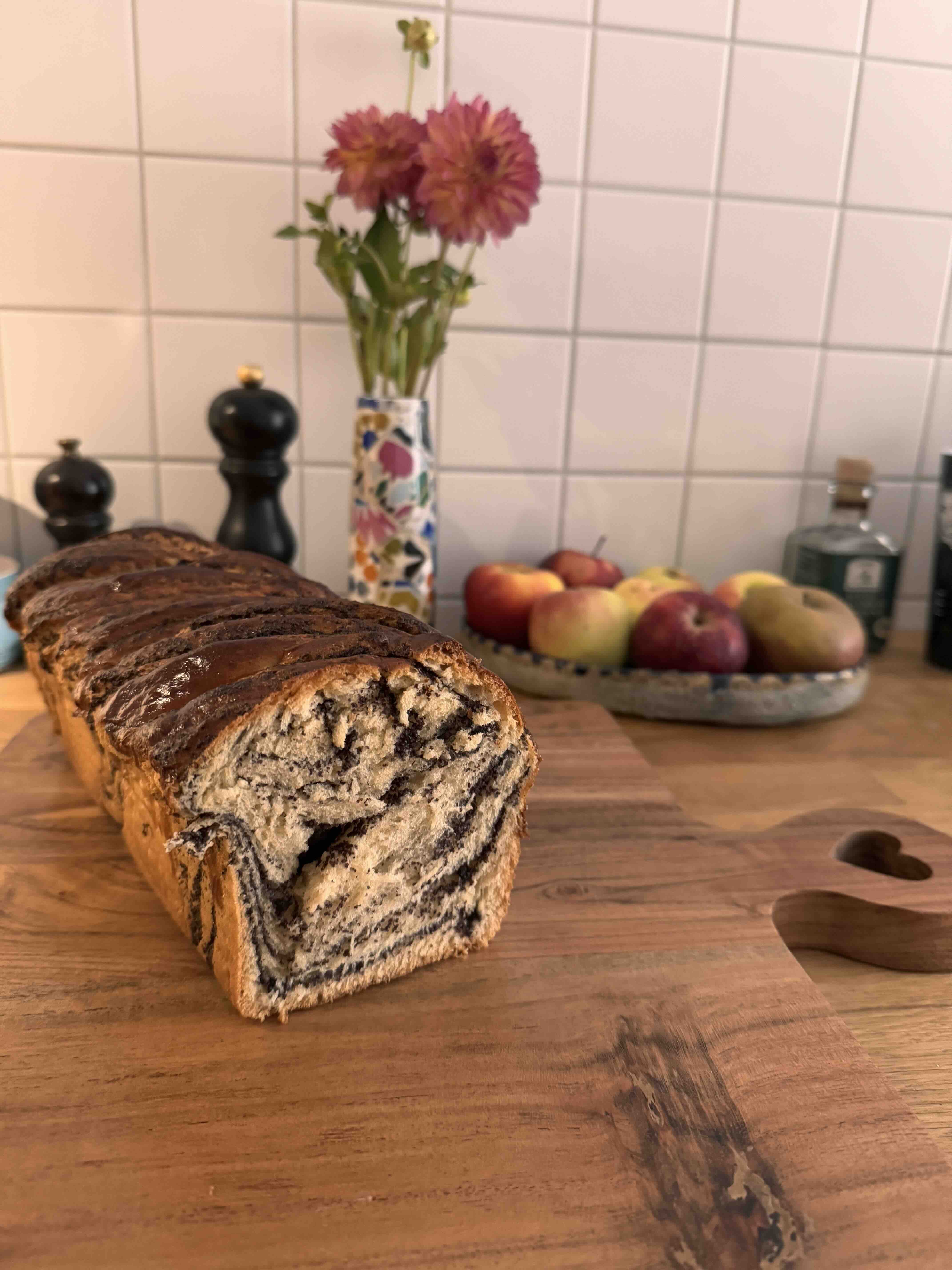 1. Încălzește laptele cu un praf de zahăr până devine călduț (aproximativ temperatura corpului). Atenție: laptele nu trebuie să fie prea fierbinte, altfel va distruge drojdia! Adaugă drojdia în laptele călduț și amestecă. Lasă să se activeze aproximativ 5 minute, până devine spumoasă. 2. Transferă amestecul de lapte în bolul mixerului cu cârlig pentru aluat. Adaugă zahărul, făina, ouăle, vanilia și coaja rasă de lămâie. Amestecă la viteza mică până când aluatul începe să se formeze, aproximativ 1 minut. 3. Adaugă untul și sarea și continuă să amesteci la viteza mică până când aluatul devine neted și lucios, 15-20 minute. 4. Scoate aluatul pe un blat ușor presărat cu făină și frământă doar de câteva ori pentru a-l omogeniza. 5. Unge un bol mare cu unt, pune aluatul înăuntru și acoperă cu un prosop umed. Lasă aluatul să crească într-un loc cald timp de 1 oră și jumătate, până își dublează volumul. Prepararea cremei de mac 1. Într-o crăticioară, amestecă macul măcinat cu laptele și zahărul pudră până obții o masă omogenă și cremoasă. Adaugă untul topit în amestecul de mac. Încălzește crema de mac încet în crăticioară la foc mic. Lasă să fiarbă ușor aproximativ 3 minute, amestecând din când în când. 2. Ia crăticioara de pe foc și lasă umplutura să se răcească și să se umfle timp de minimum 15 minute înainte de a o folosi. În acest timp, macul va absorbi lichidul și umplutura va căpăta consistența potrivită pentru întindere. Asamblarea: 1. Unge două forme de cozonac de 23 × 13 cm cu unt și tapetează cu hârtie de copt. 2. Scoate aluatul dospit pe un blat curat de lucru. Împarte aluatul în două părți egale și acoperă a doua jumătate cu un prosop curat. 3. Cu sucitorul, întinde prima jumătate de aluat într-un dreptunghi de aproximativ 40 × 45 cm și grosime de 3 mm. 4. Întinde jumătate din umplutură pe tot aluatul. 5. Începând de la latura lungă, rulează aluatul strâns. 6. Taie ruloul în sens longitudinal, pe toată lungimea, astfel încât să obții două șuvițe lungi. 7. Răsucește cele două șuvițe una în jurul celeilalte pentru a forma o împletitură lungă. 8. Transferă cu grijă împletitura în forma de cozonac, acoperă cu un prosop umed și lasă să crească într-un loc cald timp de 1 oră și jumătate, până își dublează volumul. 9. Repetă procesul cu a doua jumătate de aluat și umplutură. 10. Preîncălzește cuptorul la 180°C. 11. Așează formele de cozonac pe o tavă de cuptor și coace timp de 40-50 minute, până când babkele devin aurii. 12. Dacă se rumeneste prea repede, acoperă tava cu folie de aluminiu. |