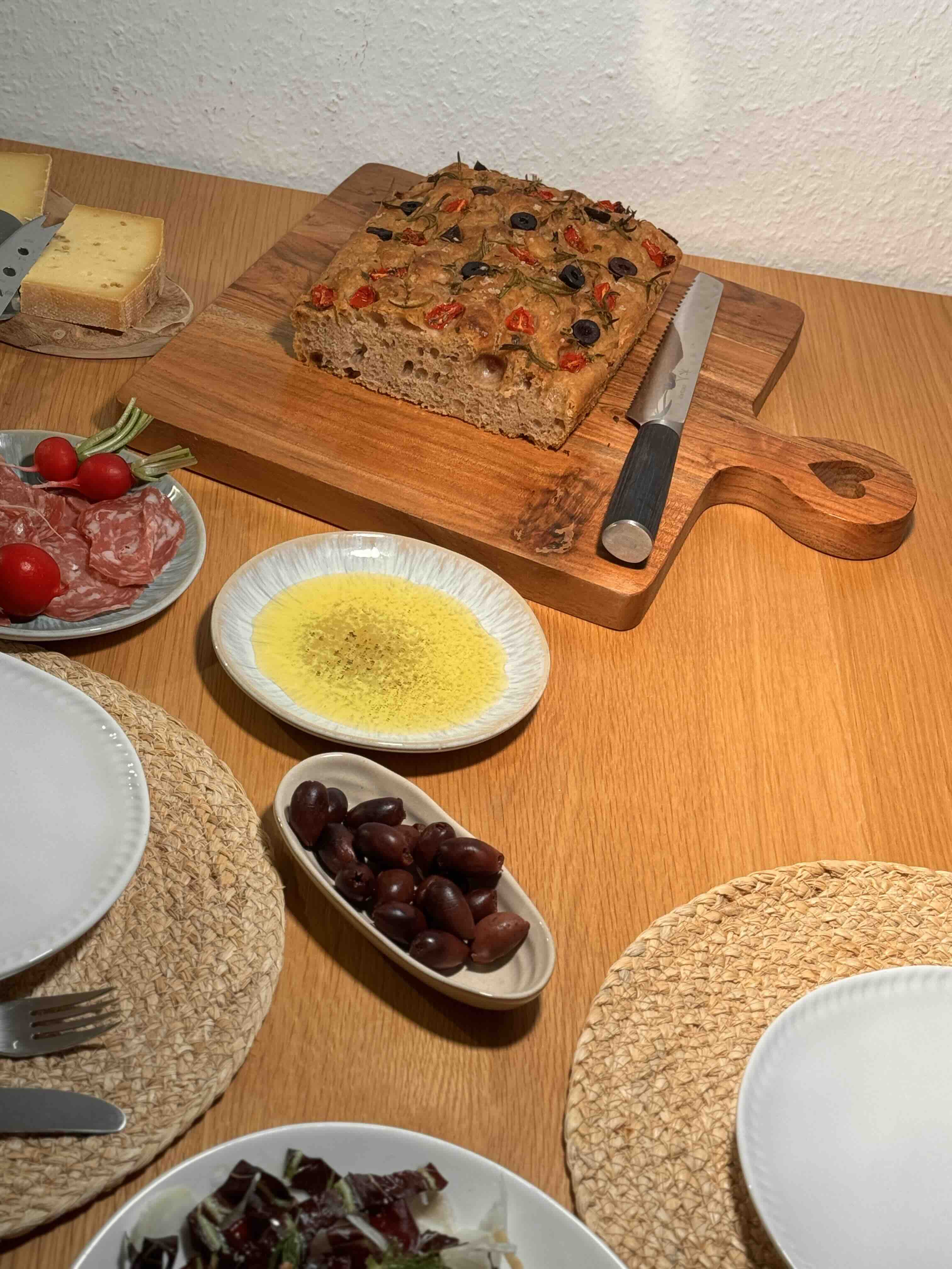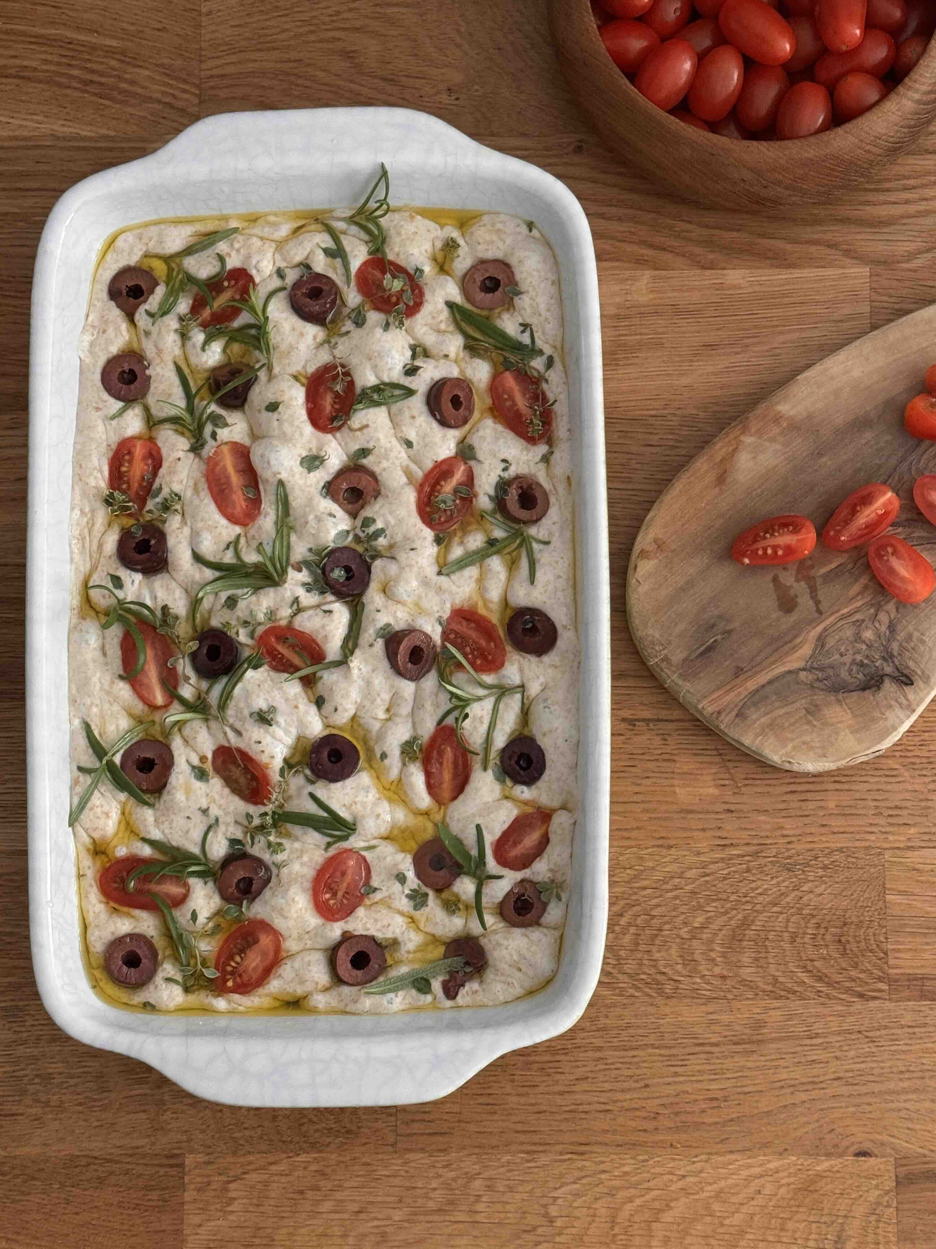 Ziua 1 Amestecă un preferment (maia de început) din 200 g făină de speltă, 200 g apă și 50 g maia. Acoperă și lasă-l să stea 3–4 ore. Adaugă restul de făină și apă, apoi uleiul de măsline și sarea peste preferment și amestecă totul bine. Lasă aluatul să dospească la temperatura camerei timp de 4–6 ore, în acest timp fă 3–4 seturi de întinderi și împăturiri. Pune aluatul în frigider peste noapte. Ziua 2 Scoate aluatul din frigider și pune-l într-o tavă ceramică, unsă cu ulei de măsline. Nivelează-l ușor cu degetele umede, fără să îl presezi prea tare. Lasă aluatul să crească la temperatura camerei cel puțin 1 oră, acoperit cu un prosop curat. Între timp, preîncălzește cuptorul la 250 °C (căldură sus-jos, fără ventilație) și pune un vas cu apă înăuntru. După ce aluatul a crescut, stropește-l bine cu ulei de măsline și apasă ușor cu degetele ca să formezi gropițele specifice focacciei. Presară deasupra: * sare mare * ierburi aromatice (rozmarin, oregano, cimbru) * măsline (feliate sau întregi, după preferință) * roșii cherry Redu temperatura cuptorului la 230 °C și coace focaccia timp de 20 de minute. Scoate vasul cu apa din cuptor și mai coace focaccia 20 de minute până când este aurie și crocantă la suprafață. Dacă focaccia nu se desprinde din tavă, o puteți acoperi timp de aproximativ 30 de minute cu un prosop din bumbac, cât timp este încă fierbinte. Condensul ajută la desprinderea focacciei din tavă. Apoi, scoate focaccia pe un grătar pentru răcire, astfel încât umiditatea să se poată evapora din nou. |